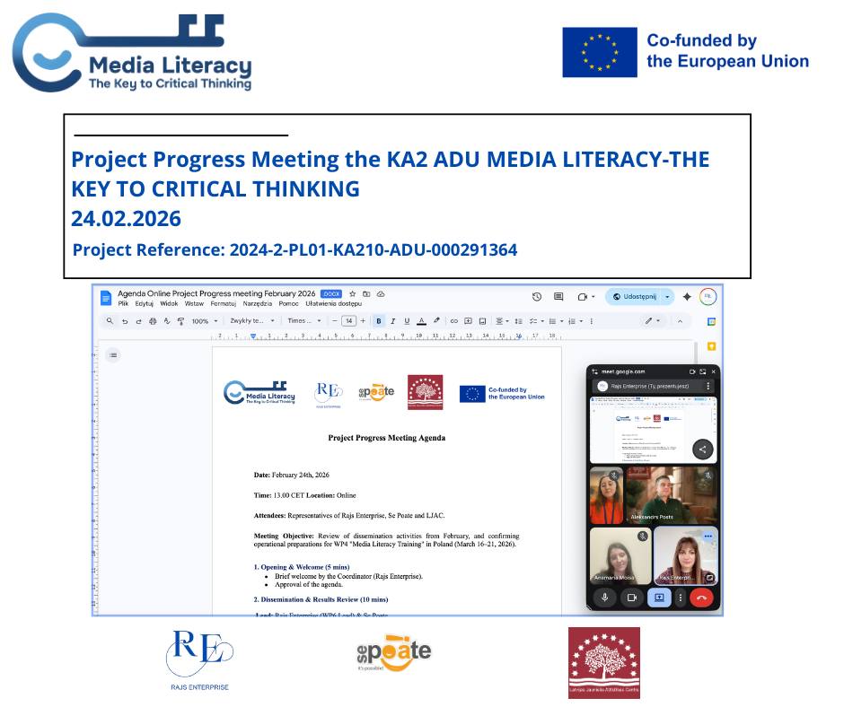Dziś odbyło się owocne spotkanie online partnerów projektu „Media Literacy – The Key to Critical Thinking”. 🖥️ Razem z zespołami z Rumunii 🇷🇴 (Se Poate) oraz Łotwy 🇱🇻 (LJAC) podsumowaliśmy nasze dotychczasowe działania promocyjne i doppieliśmy ostatnie szczegóły nadchodzącego szkolenia w Polsce! 🇵🇱
